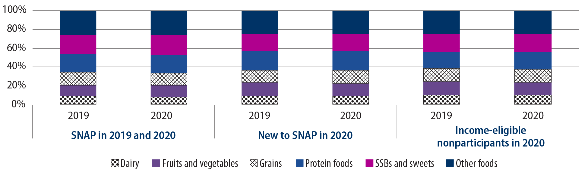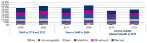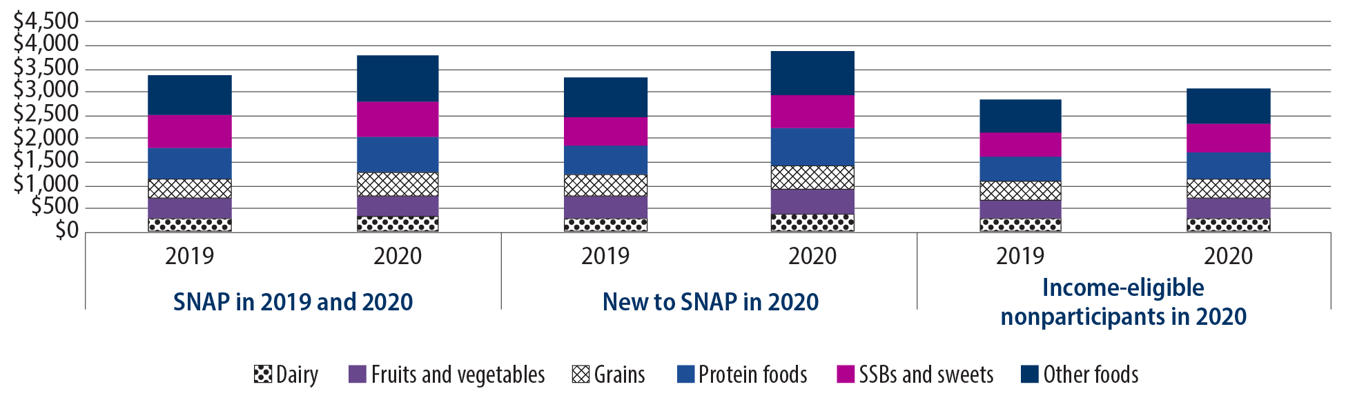 The purposes of this research were to explore the characteristics of households with children that joined SNAP after substantial changes were made to the program in the early stages of the pandemic and to learn how the changes affected food purchases. We used household-based scanner data to assess demographic characteristics and food purchase expenditures by category of food across households with children that (1) participated in SNAP in 2019 and 2020, (2) joined SNAP in 2020, or (3) were income-eligible nonparticipants. We describe how the findings from this research relate to the literature on why eligible households might not participate in SNAP, even with what is known about the benefits of the program on food and nutrition security. (Food security refers to people having access at all times to sufficient food, and nutrition security adds the further qualifier that the food be healthy, safe, and affordable [US Department of Agriculture Food and Nutrition Service, 2022].)