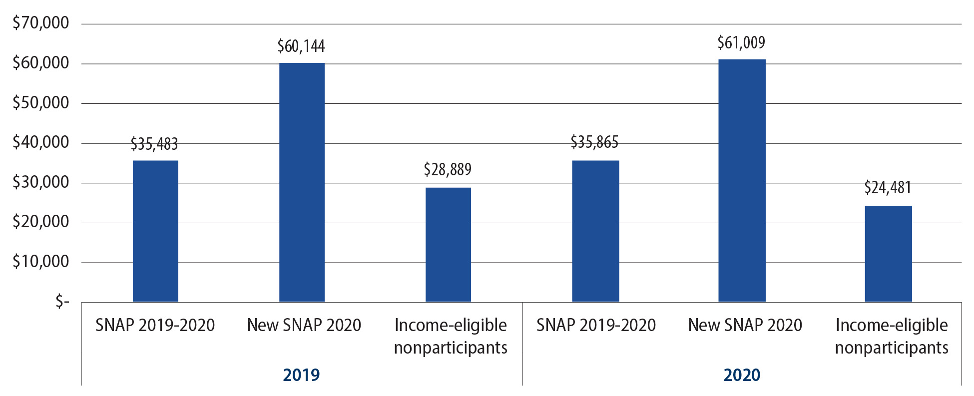 As shown in Figure 1, the average annual income of households with children that were new to SNAP in 2020 was substantially greater than those of 2019–2020 participating households with children in both 2019 and 2020. Households with higher incomes might not have participated in SNAP before the pandemic because the benefits, which are scaled based on income, were too small to make it worth their while to participate. With the increase in benefits to the maximum amount based on household size, higher-income households thus had a greater incentive to participate.[2] In contrast to participants, the average income of income-eligible nonparticipants was substantially lower in both 2019 and 2020, indicating that some of the lowest-income households did not participate. The pattern of differences in average annual income by participation status and year was similar across all race and ethnicity groups (not shown in the figure).