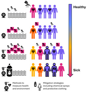 A growing number of people are being impacted by mosquito-borne diseases (Gizaw et al., 2024). Urbanization causes shifts in population density and changes in the landscape that affect local wind and temperature patterns in addition to changing locations where water collects, affecting exposure risk (McDevitt-Galles et al., 2024). SCDTs can be leveraged to model how buildings trap heat and pollution to make urban heat islands and street canyons, which can impact windspeed (Pan et al., 2024). This technology can also be used to understand how structures and ground cover affect water runoff and accumulation (McGrane, 2016). Using SCDTs to forecast where mosquito populations are likely to emerge could suggest mitigation approaches (e.g., eliminating standing water, treating breading areas, using mosquito nets) and help manage resources.