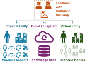 Because IoT sensors, wearables, and mobile devices collect continuous, real-time information with high spatial accuracy, these technologies are frequently suggested for use with digital twins (DTs). DTs are a virtual representation of a real-world object that can be used to simulate and understand responses to different scenarios (Figure 1). One of the key elements of a DT is bidirectional data flow between the real-world object and virtual representation, which is the gap that IoT sensors, wearables, and mobile devices have helped to fill. As more data are collected and different scenarios are encountered and tested (i.e., labeled data), the knowledge base that feeds the DT grows and leads to more accurate results and more complex simulations with less uncertainty (Riahi et al., 2025).