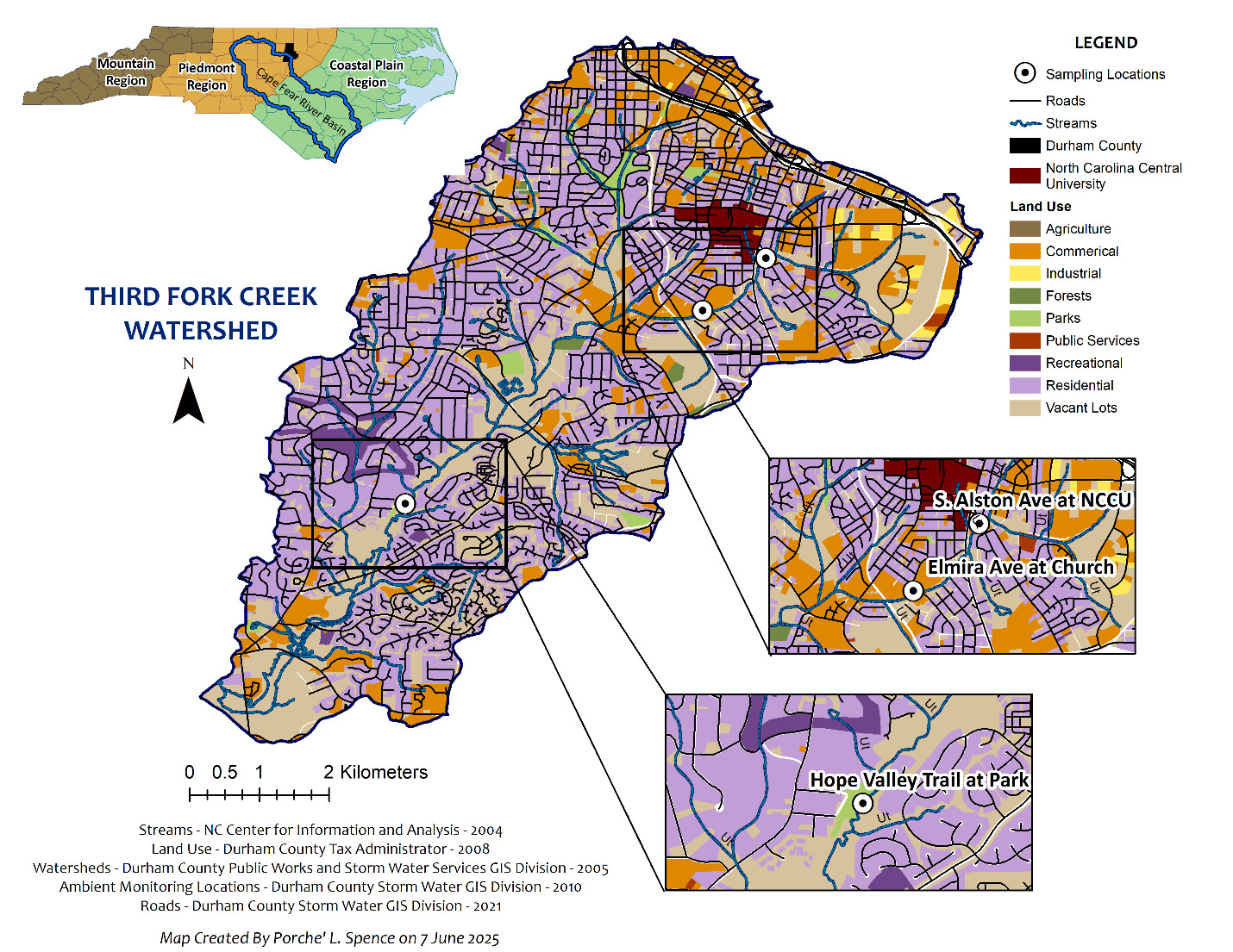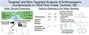 Surface waters in North Carolina, including the Cape Fear River Basin, have long-standing contamination from industrial discharges, wastewater effluent, agricultural runoff, and urban development; notably, the Cape Fear River has sustained PFAS contamination linked to upstream industrial sources for decades (McCord & Strynar, 2019). These North Carolina surface water systems are also vulnerable to episodic mobilization of pollutants during hurricane season: intense rainfall and flooding increase runoff from roadways and urban areas, flush personal care products and other consumer chemicals into streams, and can release contaminants from compromised wastewater infrastructure and storm-related debris—impacts documented following major storms, such as Hurricane Florence and Hurricane Helene (Aly et al., 2021; Hedgespeth et al., 2021; Walker-Franklin et al., 2025). Third Fork Creek (TFC) is a 16.6-square-mile urban tributary within the Cape Fear River Basin in Durham, North Carolina, that flows into Jordan Lake, a drinking water source and recreational resource. TFC is designated nutrient sensitive and has shown declining indices of water quality—its water quality index dropped from 77 in 2021 to 64 in 2022—driven by elevated bacteria, impaired aquatic life, and nutrient concerns (City of Durham, n.d.; North Carolina Department of Environmental Quality, n.d.). Prior work has likewise identified TFC as impaired (Gerald et al., 2021; Spence, 2015). However, existing monitoring in TFC and similar water systems tends to focus on a limited suite of parameters and may miss anthropogenic organic contaminants that could influence aquatic health and remediation priorities.