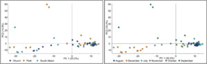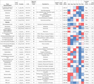Volcano plots used differential analysis (t test or analysis of variance) and determined p values (adjusted p values, ratios, fold change, covariance, etc.) to analyze differences between sample groups, including by location and month sampled. Significant features displayed in the volcano plot are plotted by their log-fold change in abundance greater than 2 and p <0.05. Principal component analysis (PCA) was performed between the groups, which identified and grouped samples with similar peaks, assessing the relationship of features between the different sample types. All statistical analysis for quantitation was performed using Prism 10 (GraphPad, San Diego, California). Differences were considered statistically significant at p <0.05. All quantified values are represented as average plus or minus standard deviation (n = 2).