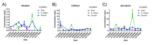 Sucralose did not show strong Spearman correlations with routine water quality parameters, but it covaried with other indicators of wastewater influence like caffeine, a contaminant commonly studied in TFC (Spence, 2015). Sucralose reached a maximum of 53.5 ng/L at the South Alston site in October. Reported concentrations in the literature vary by setting: treated wastewater effluent is typically in the low microgram (µg)/L range (roughly hundreds to a few thousand ng/L; Subedi & Kannan, 2014), source waters for drinking water treatment plants have been reported from tens to several thousand ng/L (Mawhinney et al., 2011), and surface water levels range from single digit ng/L in minimally impacted areas to µg/L levels in effluent-dominated reaches (Heider et al., 2018). Thus, the 53.5 ng/L measured here is consistent with a detectable wastewater signal but is lower than typical effluent concentrations. Four pharmaceuticals were tentatively identified, with their largest peak areas also observed at South Alston, suggesting this site experienced the greatest influence from wastewater-derived inputs (Buerge et al., 2009). Temporal patterns, however, were not consistent across tracers: peak areas and concentrations of sucralose, caffeine, and the detected pharmaceuticals did not align across all sampling dates (Whitall et al., 2021). Differences in human metabolism and environmental persistence likely account for these discrepancies—sucralose is comparatively recalcitrant and persists longer in the environment than caffeine and many pharmaceuticals, which are more rapidly metabolized and degraded (Grice & Goldsmith, 2000; Roberts et al., 2000; Tollefsen et al., 2012). Consequently, co-occurrence of multiple tracers supports a wastewater signal at South Alston, but asynchronous temporal trends highlight the value of using several complementary indicators and repeated sampling to characterize inputs.